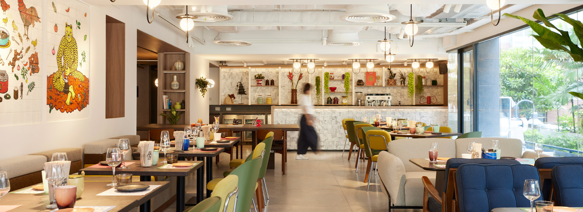 The lobby serves multiple purposes – it’s a bar, a co-working space, an inviting dining area, and even features an outdoor space.