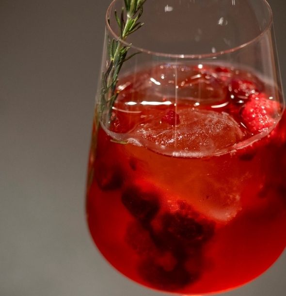 ウォッカで冬らしさを、グレナデンで華やかな赤い甘さを、ライムで爽やかなバランスを。そこに、雪のようにきらめくスパークリングワインを合わせ、ローズマリーとベリーをクリスマスツリーのようにあしらった、ホリデースプリッツカクテルです。