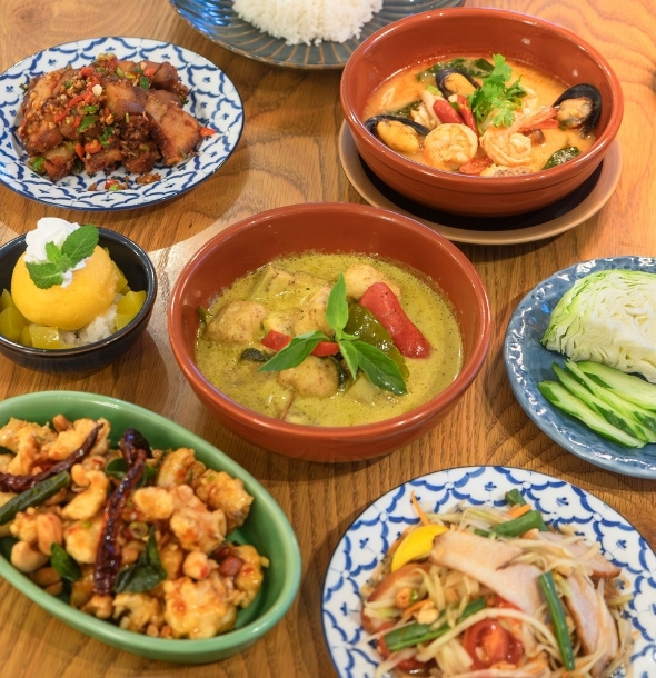 スパイシーな青パパイヤサラダと豚ネックのグリル、香草とスパイシーな揚げ魚サラダ、豚バラのカリカリ炒め(チリと塩風味)、シーフードのトムヤムスープ、魚団子のグリーンカレー、ジャスミンライス、マンゴーアイスともち米のデザート