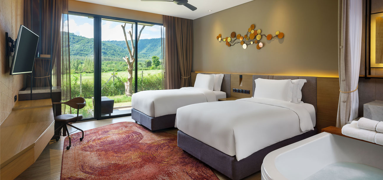اشعر وكأنك في منزلك وسط أجواء من الفخامة والراحة. تحتوي غرفة ديلوكس بمساحة 36 مترًا مربعًا على سرير كبير مزدوج أو سريرين منفصلين، كما تحتوي على شاشة تلفزيون LCD وأدوات تحضير الشاي والقهوة عالية الجودة ومغطس استحمام عميق.