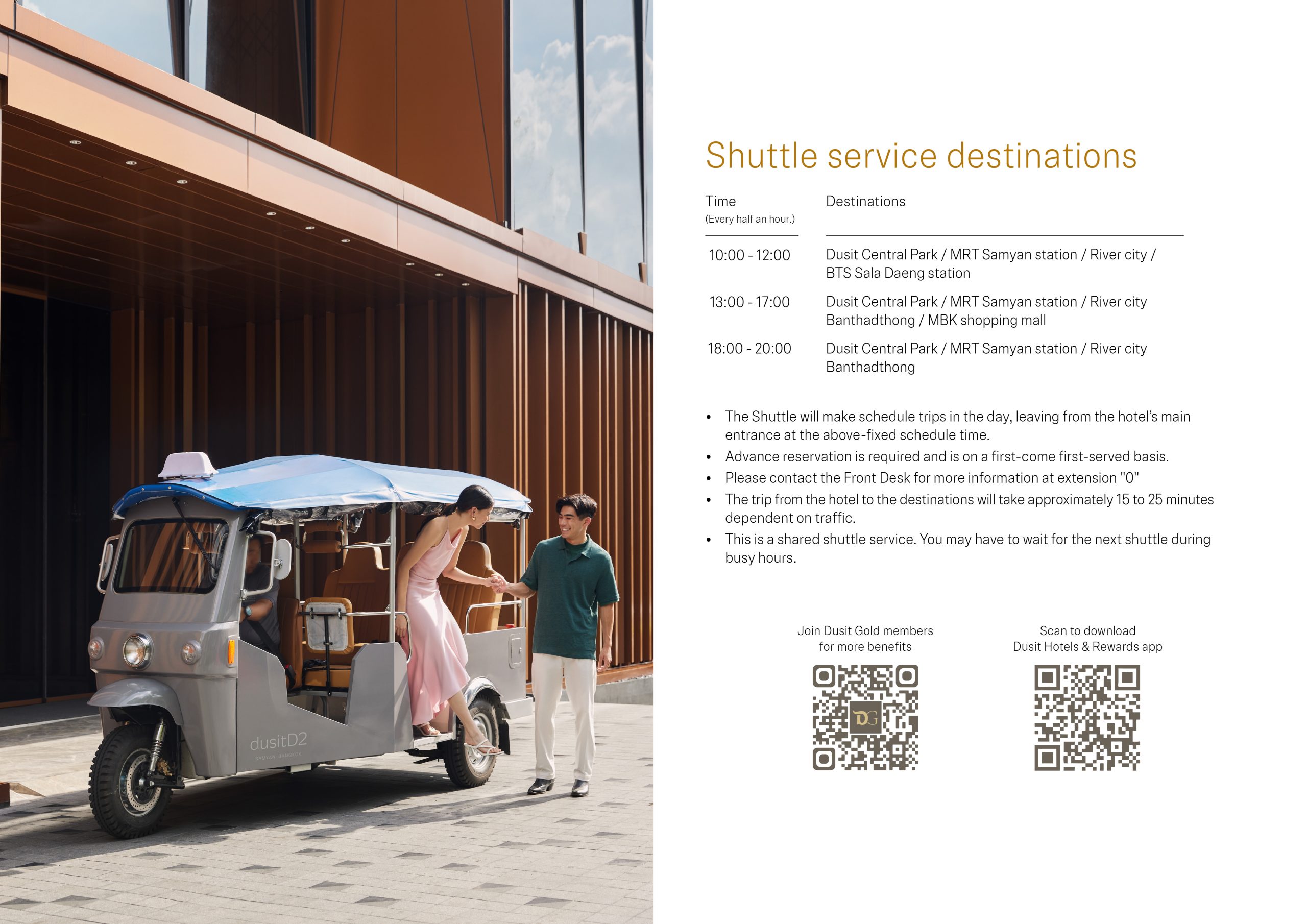 TukTuk shuttle drop-off service from the hotel to Dusit Central Park | MRT Samyan Station | BTS Sala Daeng Station | River City | Banthadthong | MBK Shopping Mall.