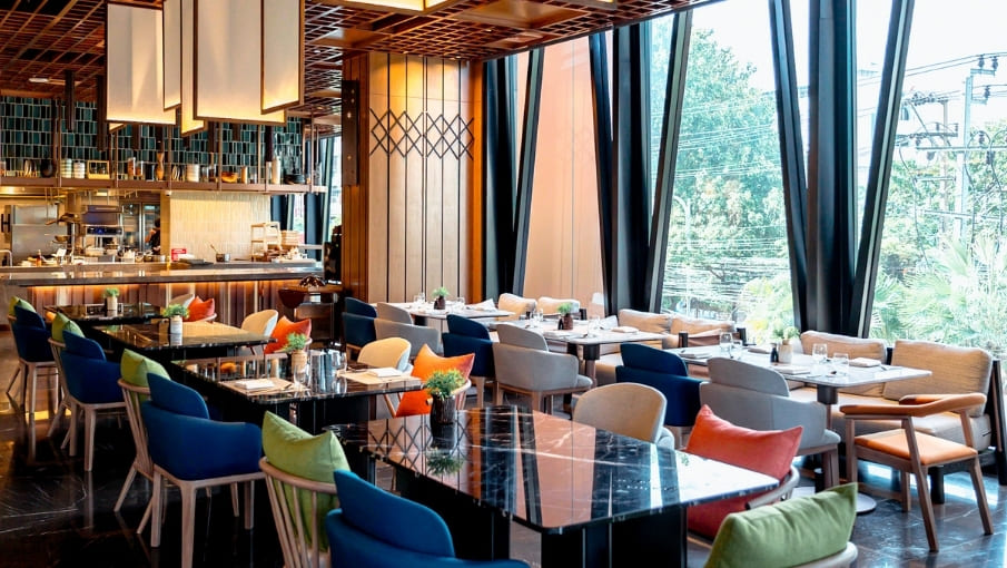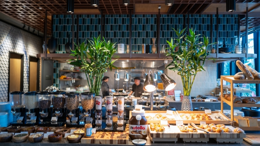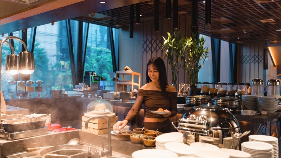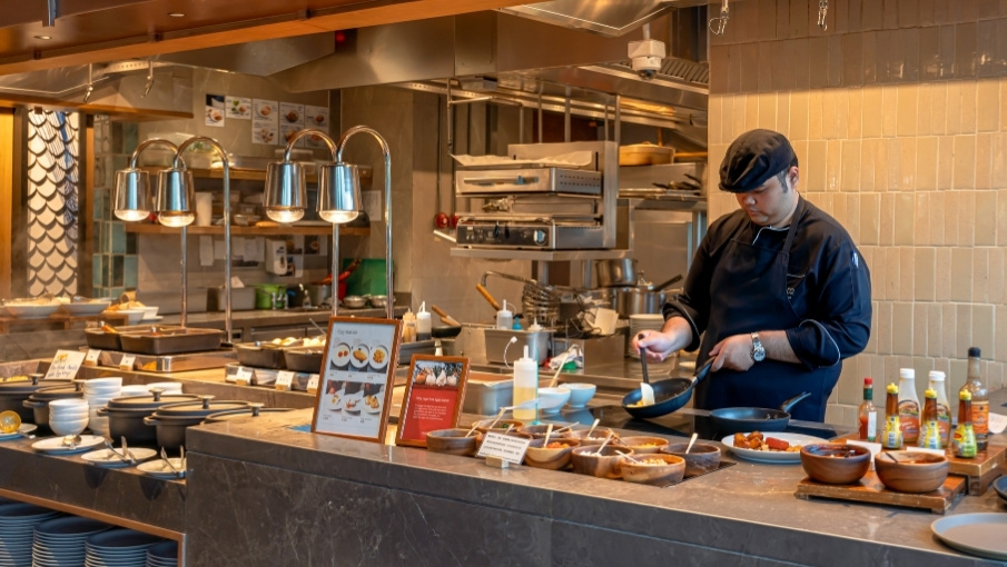 Brighten up your morning at Dusit Gourmet with a generous breakfast buffet in Bangkok, featuring live egg and noodle stations, fluffy pancakes, a fusion of Thai and Western flavours, a vibrant salad bar and an array of cheeses.