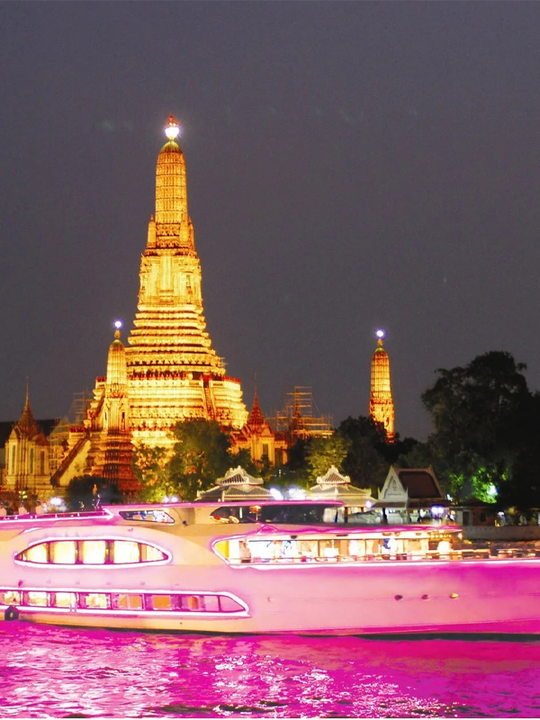 Experience the enchantment of the Chao Phraya River on our Dinner Cruise. Enjoy a romantic evening in Bangkok with breathtaking panoramic night views. Relish a delicious Thai and International Buffet Dinner as we sail past famous landmarks like Memorial Bridge, Temple of the Dawn, The Royal Grand Palace, and the Temple of the Emerald Buddha. Admire the beautiful decorations and vibrant colored lights along the riverside. Capture stunning photos before we return to the River City Pier for a memorable evening.