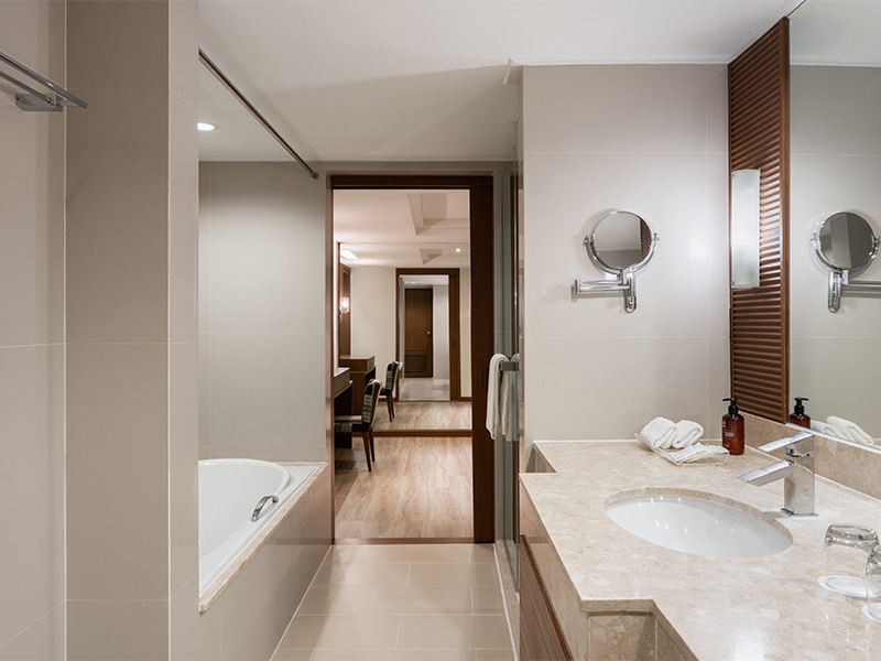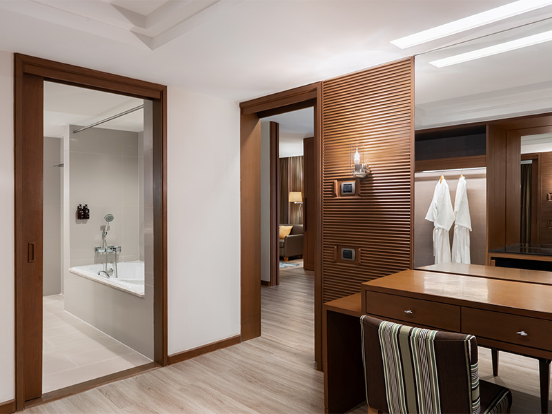 اكتشف أقصى درجات الراحة في ملاذك الواسع والمجهز بالكامل. يمتد الجناح التنفيذي على مساحة 85 مترًا مربعًا ويضم مساحات منفصلة للمعيشة، والنوم، وحجرة ملابس، وغرفة تزيين. يمكن تحويله إلى جناح من غرفتيّ نوم عبر الاتصال بغرفة فاخرة حسب الطلب.