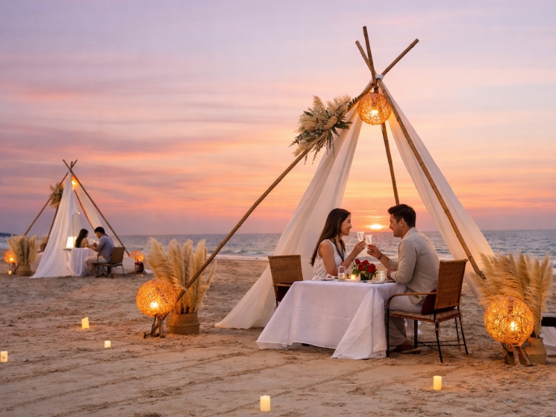 For couples seeking an elevated and intimate experience, enjoy a private dinner for two by the jetty, framed by stunning sea views and a beautifully romantic ambience. A bottle of sparkling wine will await you upon arrival, setting the tone for an enchanting evening.