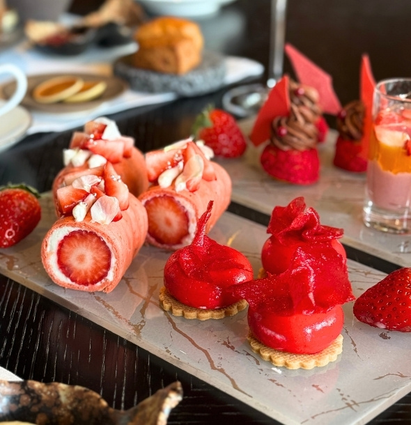 Strawberry and hojicha mousse and matcha cake highlight the depth of tea flavours while complementing the berries’ gentle sweetness and acidity. Other delights include a strawberry and coconut tart, along with savoury items such as an American-style corn dog featuring Northern Thai sai ua sausage paired with senmaizuke from Kyoto’s long-established pickle maker, Nishiri, bringing Kyoto and Thai flavours together.