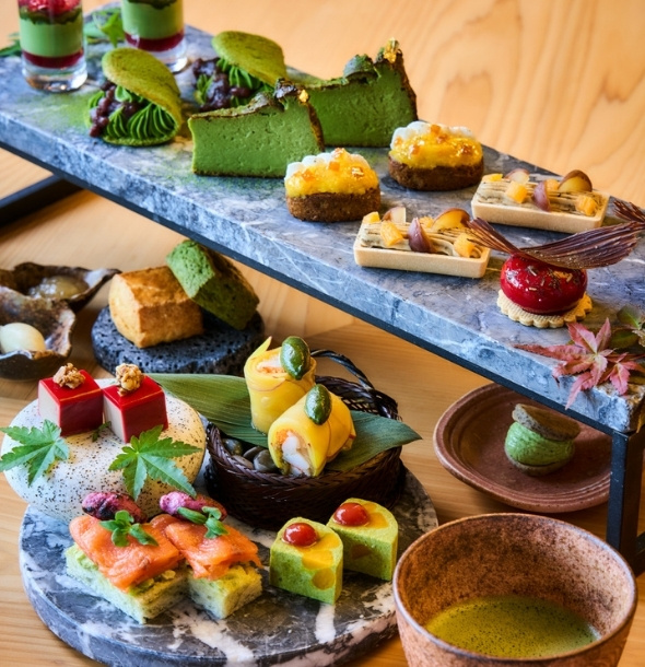 ほうじ茶とマンゴーのムースや、抹茶チーズケーキ、ほうじ茶のブリ二とキャビアといった、お茶の深い風味を生かしたスイーツやセイボリー を、優雅なティーセレクションとともにお楽しみいただけます。