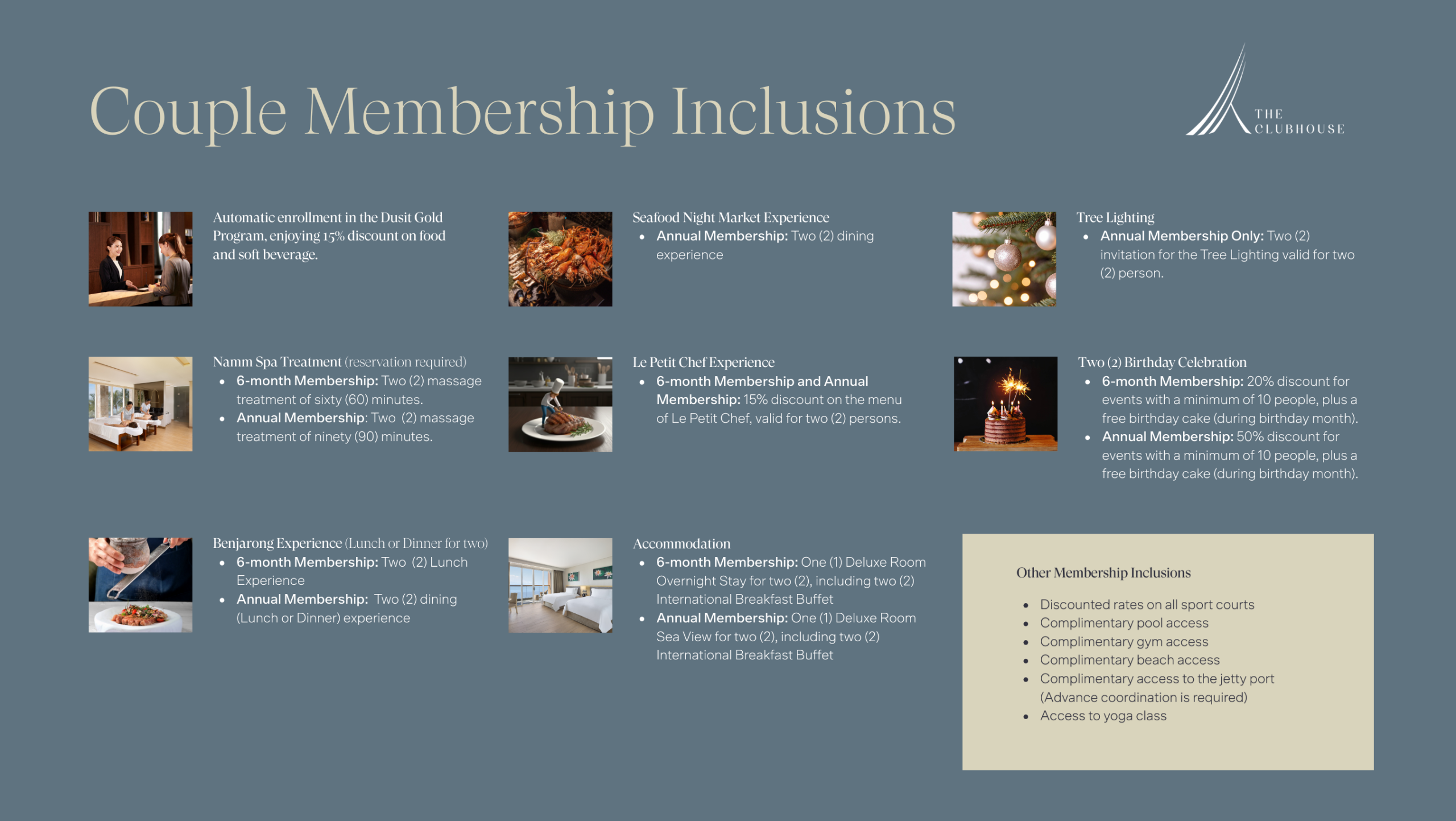Experience the pinnacle of leisure and indulgence with The Clubhouse – Early Bird Membership at Dusit Thani Mactan Cebu Resort. From discounted sports courts and curated spa treatments to culinary journeys like Benjarong, Le Petit Chef, Seafood Night Market. Plus, overnight stays and wellness access, every privilege is designed to elevate your lifestyle. Celebrate birthdays, attend signature events, and enjoy unparalleled access to resort amenities in a serene, luxurious setting.