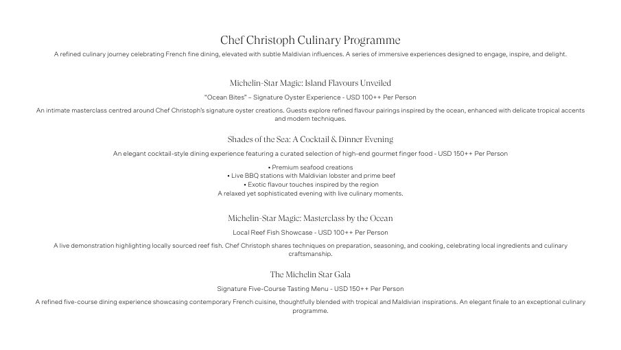 The evening begins with handcrafted cocktails inspired by Chef Christophe’s French heritage and the tropical essence of the Maldives. As the sun sets over the turquoise waters, guests are invited to indulge in a refined multi-course dinner featuring seasonal ingredients, creative techniques, and Chef Christophe’s signature harmony of colour, texture, and taste.
