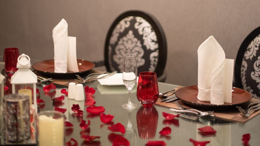 Your evening is elevated with a bouquet of red roses, a box of six artisanal pralines, and live musical entertainment, creating a setting that is both intimate and indulgent.